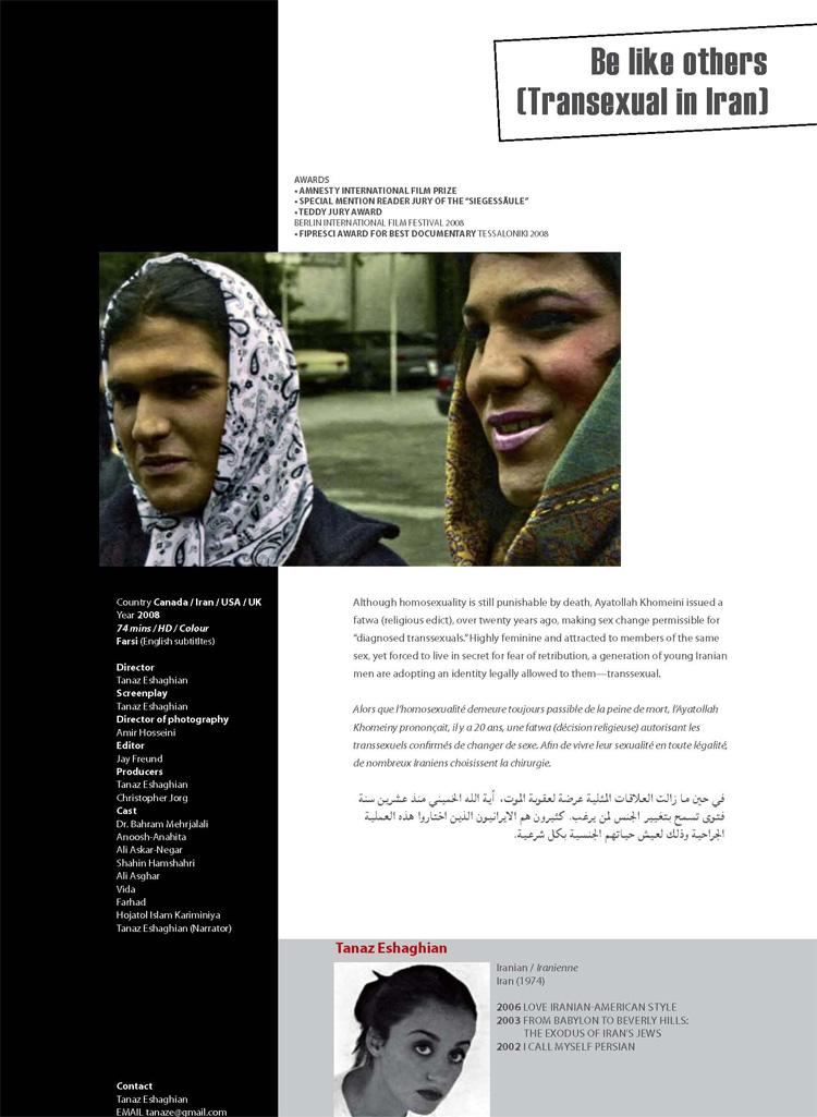 Una mirada íntima y firme de la vida en Irán, visto a través de la lente de los que viven en sus márgenes, 'Be Like Others' es una mirada provocativa a una generación de jóvenes iraníes que eligen someterse a una cirugía de cambio de sexo.