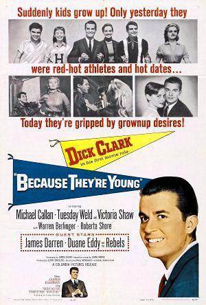 Because They're Young 1960 0.00 (0 votos) Votar esta película Título originalBecause They're Young Duración102 min. País DirectorPaul Wendkos GuiónJames Gunn, John Farris RepartoDick Clark, Victoria Shaw, Michael Callan, Tuesday Weld, Warren Berlinger, Linda Watkins, Roberta Shore, Doug McClure, Chris Robinson, Wendell Holmes, Stephen Talbot, Franklyn Farnum, Philip Coolidge, Kathryn Card, Bess Flowers GéneroDrama