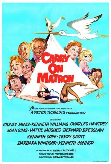 Carry On Matron 1972 0.00 (0 votos) Votar esta película Título originalCarry On Matron Duración87 min. País DirectorGerald Thomas GuiónTalbot Rothwell RepartoSid James, Kenneth Williams, Charles Hawtrey, Joan Sims, Hattie Jacques, Bernard Bresslaw, Kenneth Cope, Terry Scott, Barbara Windsor, Kenneth Connor ProductoraThe Rank Organisation GéneroComedia
