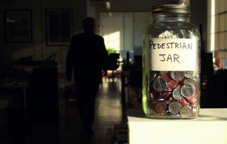 En una oficina los empleados idean una solución a los frecuentes atropellos de peatones que se producen en la ciudad: "Cada vez que atropelles a un peatón en el trayecto a tu trabajo, tendrás que depositar una moneda en un tarro de cristal'.
