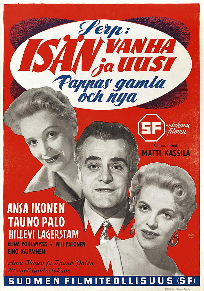Father's Old and New 1955 0.00 (0 votos) Votar esta película Título originalIsän vanha ja uusi Duración94 min. País DirectorMatti Kassila GuiónMatti Kassila, Seere Salminen. Obra: Seere Salminen RepartoAnsa Ikonen, Tauno Palo, Hillevi Lagerstam, Eino Kaipainen, Elina Pohjanpää, Veli Palonen, Marjatta Kallio, Atte Hovimaa, Alice Lyly, Akseli Vuorisola, Vieno Kekkonen, Pentti Irjala, Pirkko Karppi, Ritva Valkama, Annikki Linnoila GéneroComedia, Romance
