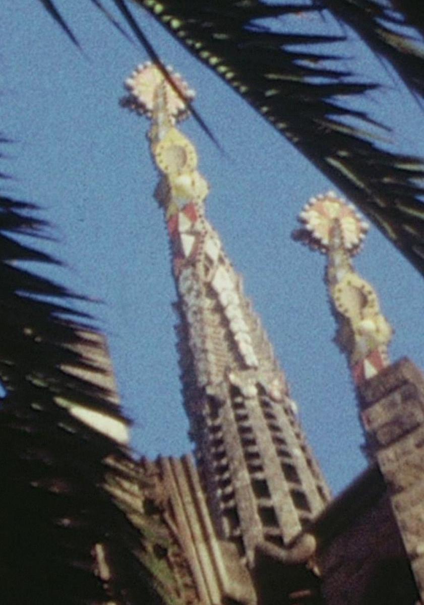 Imágenes de la Sagrada Familia de Gaudí confrontadas con breves destellos de zonas industriales y proyectos habitacionales.