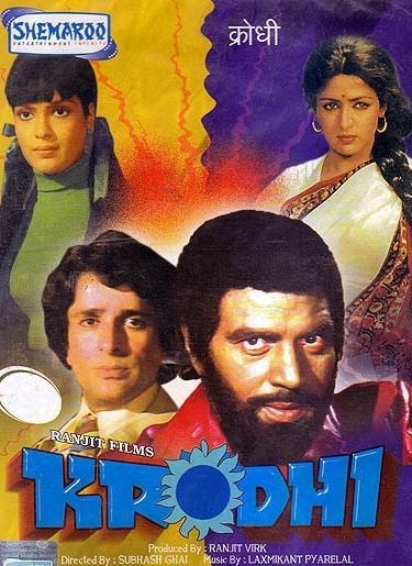 Krodhi 1981 0.00 (0 votos) Votar esta película Título originalKrodhi Duración159 min. País DirectorSubhash Ghai GuiónSubhash Ghai, Nabendu Ghosh RepartoDharmendra, Shashi Kapoor, Zeenat Aman, Pran, Hema Malini, Sajjan Adeeb, Prem Nath, Jagdish Rajpurohit, Sachin Bhowmick, Bharat Bhushan, A.K. Hangal, Sulochana Latkar, Iftekhar, Raj Mehra, Sudhir Pandey, Brahmachari, Amrish Puri, Raju Shrestha, Manmauji, Ranjeeta Kaur ProductoraRanjit Films GéneroThriller, Acción