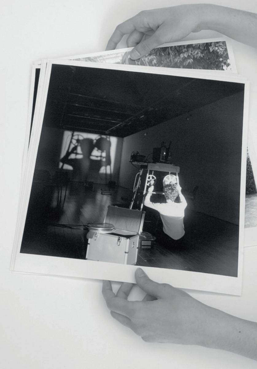 'Montaje en sala' muestra de manera explícita las peculiaridades técnicas y las convenciones inherentes a la presentación del cine. La figura del proyeccionista aquí, sin embargo, se hace visible. Sale de la cabina de proyección para mostrarse alumbrado por un segundo proyector, asistiendo así al montaje in situ de la mesa de proyección, el primer proyector y el enhebrado de película. Situado entre los dos proyectores, la performatividad de una figura que culturalmente siempre se mantuvo escondida en pos de la proyección de película, ahora se hace evidente en el proceso, reivindicando su papel como parte intrínseca de la proyección y como responsable de la misma.