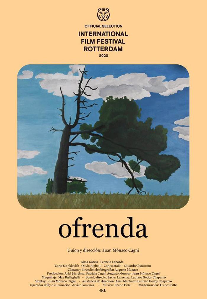 "Ofrenda" representa a dos mujeres que, en diferentes etapas de sus vidas, se encuentran en el mismo lugar. Eso puede sonar vago, pero esto es lo que es. Las jóvenes adolescentes pasan tiempo en los campos veraniegos, en almacenes desolados y abandonados y en otros edificios en las afueras de una pequeña ciudad provincial de la pampa argentina. Los mismos espacios vuelven a aparecer unos años más tarde cuando las jóvenes se encuentran nuevamente cuando una de ellas regresa con una mochila a cuestas, que simboliza el conocimiento adquirido en el tiempo que han estado separadas.