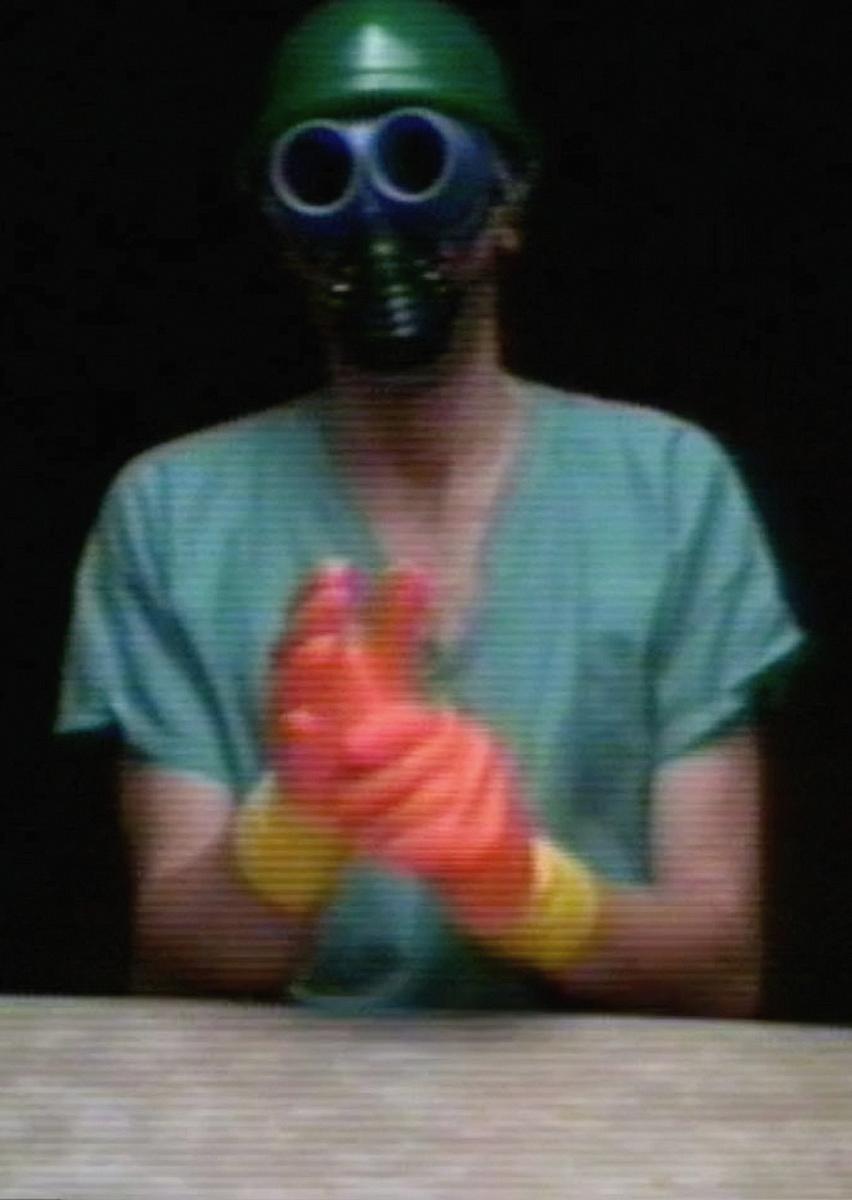 'Protective Coloration' muestra a Fisher sentado en una mesa moteada. Viste un atuendo de hospital de manga corta, "uniformes" quirúrgicos de color verde. Los clips nasales bloquean sus fosas nasales mientras que un protector bucal que parece labios falsos cubre su boca. En el transcurso de 11 minutos, se enmascara la cara y se cubre las manos con ropa brillante de colores que se acumulan para parecerse a los de la tabla de referencia estándar: se pone gorros anaranjados y luego un gorro de baño amarillo; tapándose la nariz y la boca y el equipo que ya está allí, se pone una máscara de gas negra; un antifaz de dormir negro sedoso vacía sus ojos ya cubiertos, un gorro de baño azul cian cubre el amarillo; guantes de goma amarillos chasquean sus manos y antebrazos; se pone anteojos cian, luego lucha con otro gorro de baño, naranja, sobre los otros dos. Un gorro de ducha transparente plateado remata las gorras, coronado por un casco de plástico verde. Finalmente, los guantes magenta de alta resistencia ocultan la mayor parte del caucho amarillo.