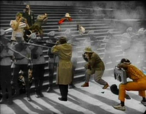 Un grupo de turistas de la década de los 80 viaja en el tiempo para introducirse en una escena clásica de "El acorazado Potemkin", de S. M. Eisenstein. En la escalinata de Odessa, los turistas, en color, interactúan con los personajes y el escenario de la película, en blanco y negro. Los turistas curiosean, comen hamburguesas y hacen fotografías sin inmutarse, mientras observan al pueblo inocente siendo masacrado por el batallón de soldados.