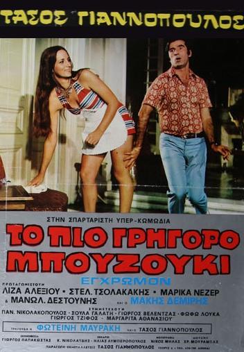 To pio grigoro bouzouki 1973 0.00 (0 votos) Votar esta película Título originalTo pio grigoro bouzouki Duración106 min. País DirectorGiorgos Papakostas GuiónKostas Nikolaidis, Ilias Lyberopoulos RepartoTasos Giannopoulos, Liza Alexiou, Marika Nezer, Stelios Tsolakakis, Soula Galati, Fofo Louka, Panagiotis Nikolakopoulos, Margarita Athanasiou, Giorgos Velentzas, Makis Demiris, Giannis Trakadas, Alekos Zartaloudis, Giorgos Tzifos, Nikos Kikilias GéneroComedia